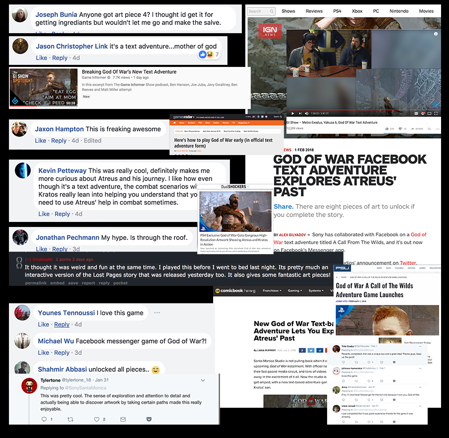 We dropped fans into the world with a text adventure on Facebook Messenger. It had a new story, all kinds of easter eggs, and exclusive art. Polygon even called it “the perfect jumping off point for Sony’s new game.”